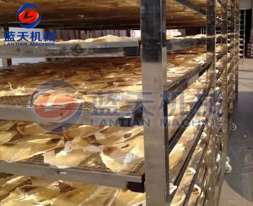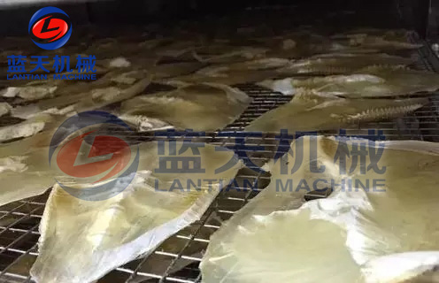 4、烘干:將魚體洗刷一次,除去沾染的污物,滴干水后,排放于特制的烘干盤上。推進熱泵烘干房,開啟主機的控制面板進行烘干,烘干過程由電腦版全自動控制,無需人工值守,一般海魚的烘干時間在22——28個小時左右。