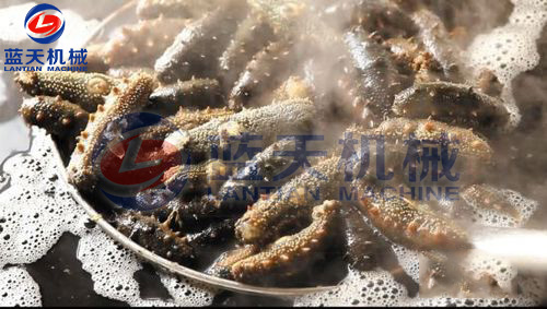 第三步:蒸煮海參:當水溫在90度時,將清洗好的海參放入鍋里蒸煮,用工具來回攪拌,防止水溫不均,這時可見到海參迅速縮小,海參刺明顯突出。約半小時后,撈出海參,視情況拌入粗鹽。