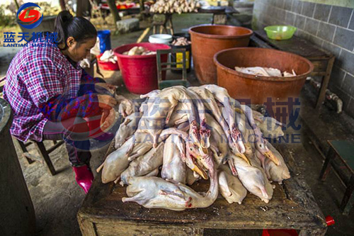 鴨只屠殺之前應(yīng)予12~24小時絕食,并給以充分清水,使之安靜休息。如此可使屠殺放血良好,并可減少未完全消化的飼料污染屠體的機會。經(jīng)屠殺后,將屠體外表洗凈,祛除余毛,并應(yīng)即速冷卻。鴨之屠體選用無骨折及瘀血斑點者,并將鴨只在肘關(guān)節(jié)及跗關(guān)節(jié)下端分別將兩翅及兩腳去掉。以左手抓住鴨之下額骨,右手持刀從口腔割掉帶舌的下額部,此處理俗稱割外五件。