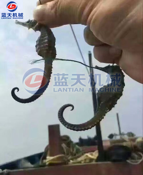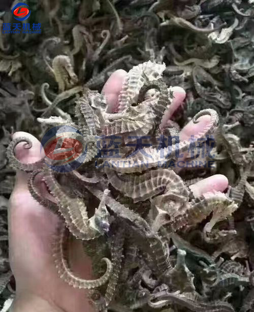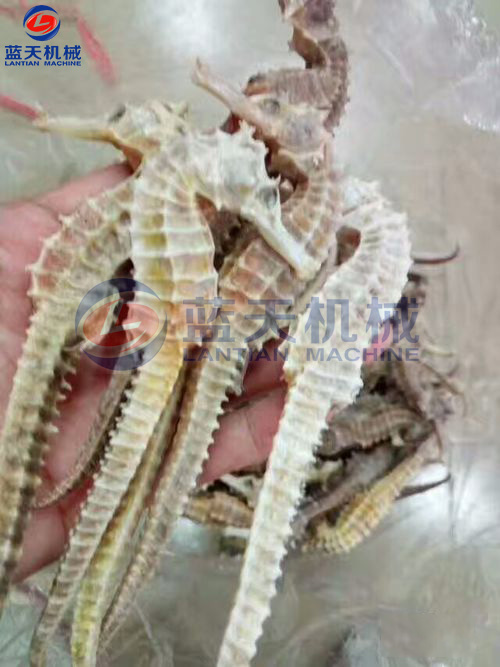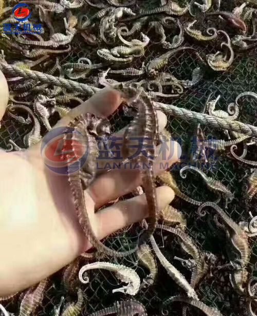 加工時.將海馬放在淡水中,清洗干凈,浸泡一段時間后,洗刷去體表灰黑色的皮膜,剖腹去掉內臟,將尾盤卷起,將處理后的海馬平鋪在物料網(wǎng)格盤中,插入物料推車隔層,將裝滿新鮮海馬的物料車推入烘干房,關閉烘干房密封門。