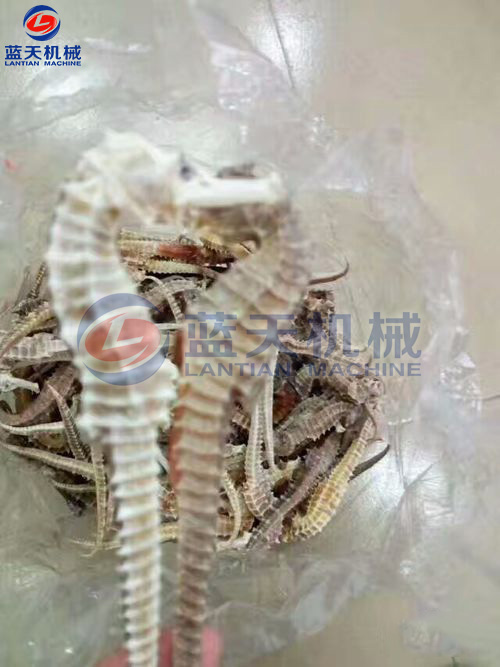 用紅線將雌雄兩只海馬并排捆扎成對,稱為“對馬”、“對海馬”。幼小的海馬烘干之后叫做“海蛆”。烘干后的海馬用干凈的紙包扎好,即為成品,可直接出售或進入塑料袋或瓦罐中,密封貯藏,每隔半個月至1個月檢查一次,防蟲防潮,發(fā)現(xiàn)變質的要及時處理。