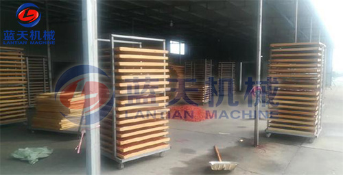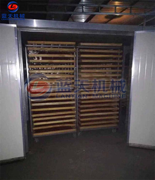 踩堆發(fā)汗:即將含水率75%一85%的辣椒,第一次將辣椒烘干到含水率50%踩堆發(fā)汗,再進行第二次烘干。踩堆發(fā)汗在辣椒干燥工藝中是一個很重要的步驟,是否采用這一步驟對辣椒品質和烘干時間、都有很大影響。辣椒在烘干過程中都有明顯的軟化和膨脹現(xiàn)象。踩堆發(fā)汗的主要作用是調質,使辣椒油向表面滲透,烘干后的辣椒顏色一致,紅潤光滑,并促使辣椒含水率趨于平衡。如不進行踩堆發(fā)汗,烘干1000公斤辣椒,熱風溫度40℃—60℃時 需時間63小時,踩堆發(fā)汗后則可縮短到40小時左右,且花黃殼顯著減少。