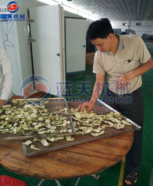 將切片好的佛手片放置于物料車托盤,注意堆放厚度不要超過3CM,這樣有助于烘房?jī)?nèi)平流風(fēng)對(duì)整個(gè)物料的烘干效果保持一致性。