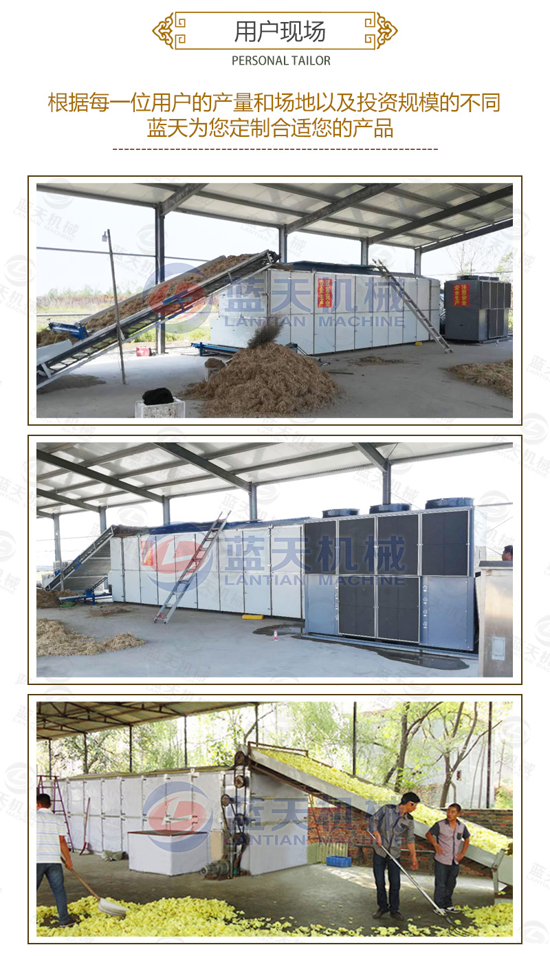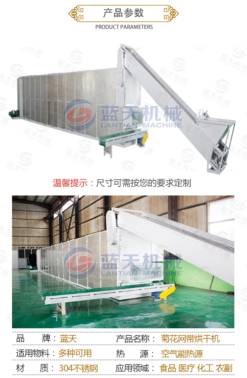 隨著生活水平的提高和壓力的增大,人們都逐漸注意養(yǎng)生,干菊花的市場(chǎng)是很大的。干菊花大多用于泡茶飲用,具有味濃香甜、去膩消食、醒腦益神之功能。菊花收獲的旺季,一直靠天晾曬菊花的菊農(nóng)就怕遇見(jiàn)陰雨天。隨著社會(huì)的進(jìn)步,科技的發(fā)展,智能烘干設(shè)備越來(lái)越深得用戶(hù)的滿意,菊花網(wǎng)帶烘干機(jī)讓菊農(nóng)徹底擺脫了靠天烘干收獲菊花的苦惱。同時(shí)牽扯到人們食用,菊花網(wǎng)帶烘干機(jī)工藝要求就很是嚴(yán)格的,因?yàn)楹芏嗑栈ㄐ枨笊虒?duì)于烘干后的菊花的色、香、形、味要求很高,要求干燥烘干后的菊花原色、原味、原樣,這就要求菊花成熟后烘干,菊花頭部分進(jìn)行強(qiáng)干燥烘干,而對(duì)菊花花瓣部分進(jìn)行弱干燥烘干。我們藍(lán)天菊花烘干機(jī)設(shè)備廠家主營(yíng)的烘干機(jī)采用智能化控制溫度,全自動(dòng)免人工操作,省時(shí)省力,讓菊花客戶(hù)打心里贊同和喜歡。