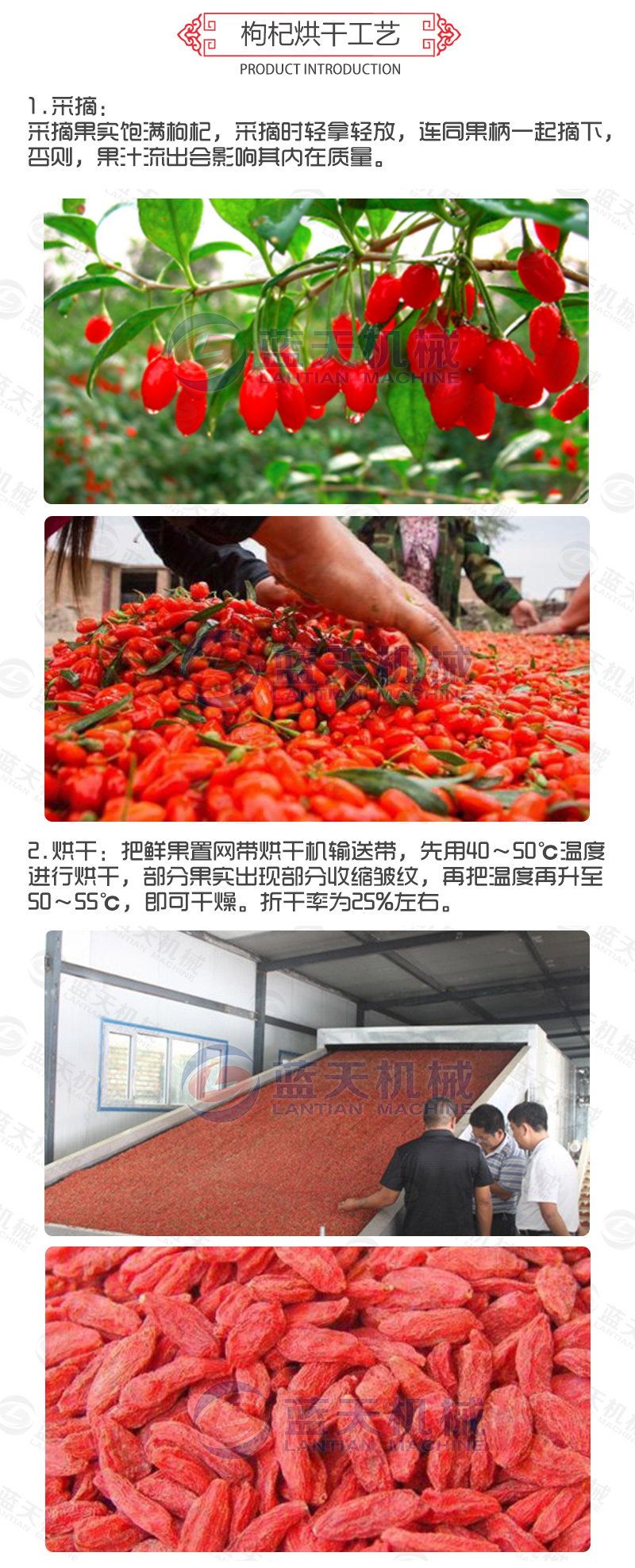 2、枸杞網(wǎng)帶烘干機(jī)烘干出來的枸杞色澤優(yōu)于自然晾曬的色澤,色正味純、細(xì)密、無黑斑,可滿足烘干各種產(chǎn)品要求,有效地保證了烘品的自然品質(zhì)。