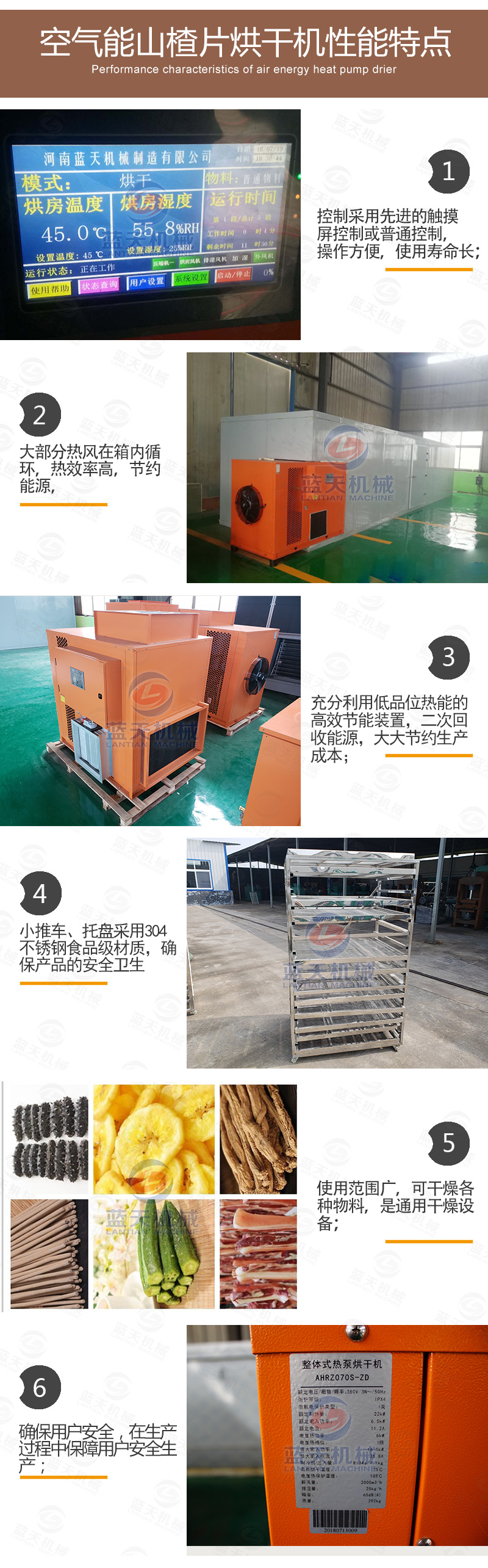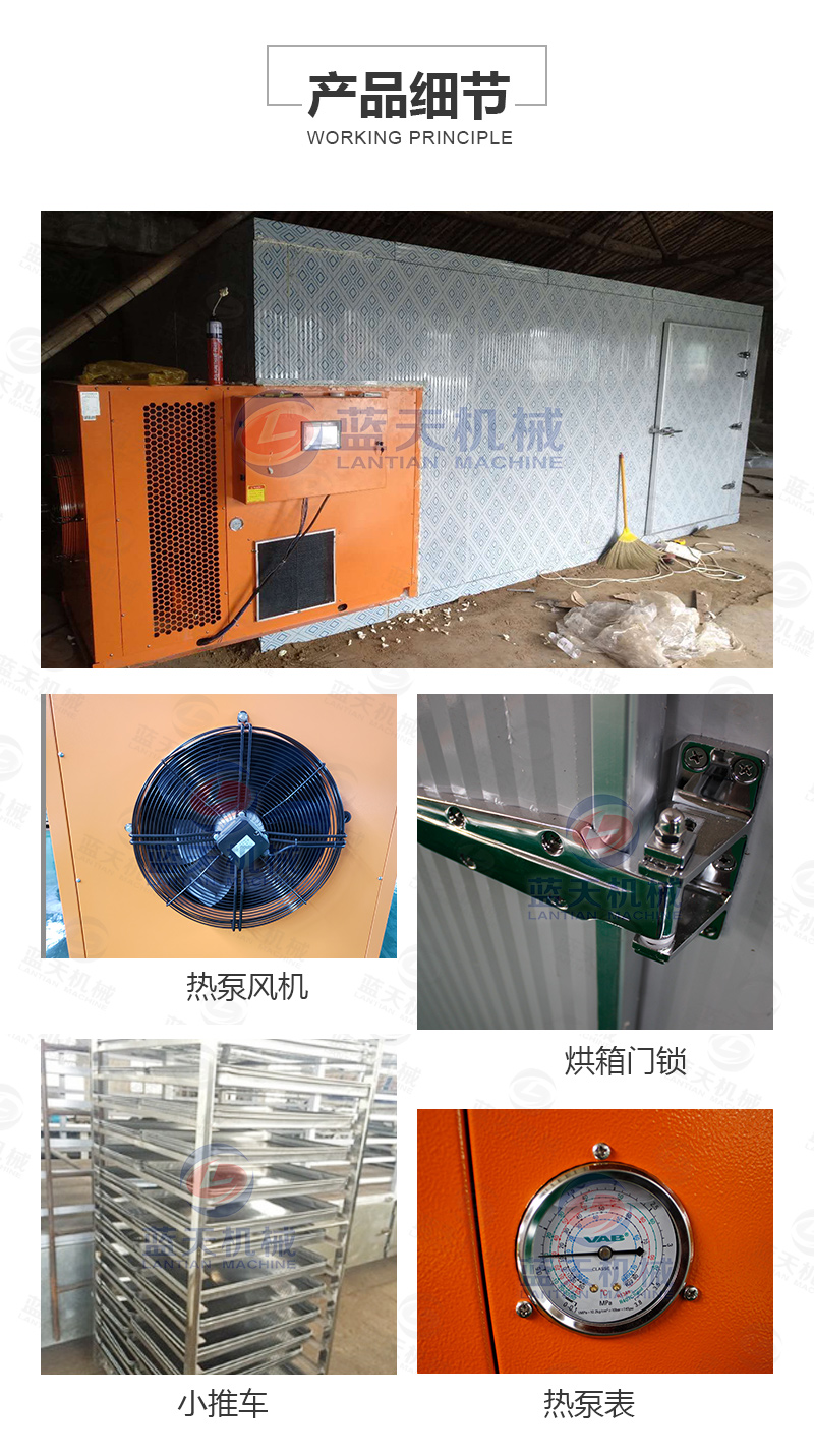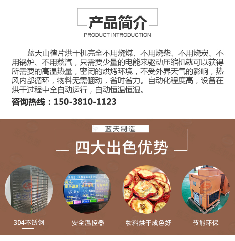新鮮山楂片的含水率約為80%,烘干的目標(biāo)含水率約為13%,使用空氣能熱泵小型山楂片烘干機(jī),將智能溫度設(shè)定為55度左右的范圍,使山楂片所含的游離水大量蒸發(fā),熱風(fēng)循環(huán)系統(tǒng)不斷輸送新風(fēng),將風(fēng)量均勻的輸送到各層架,排風(fēng),促使蒸發(fā)的水份通過(guò)凝結(jié)水管路系統(tǒng)排出。