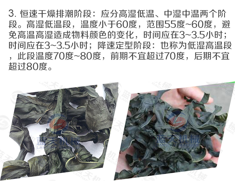 1、溫度—海帶的烘干一般要求比較低的溫度下進行,以避免高溫影響產(chǎn)品烘干后的質(zhì)量。