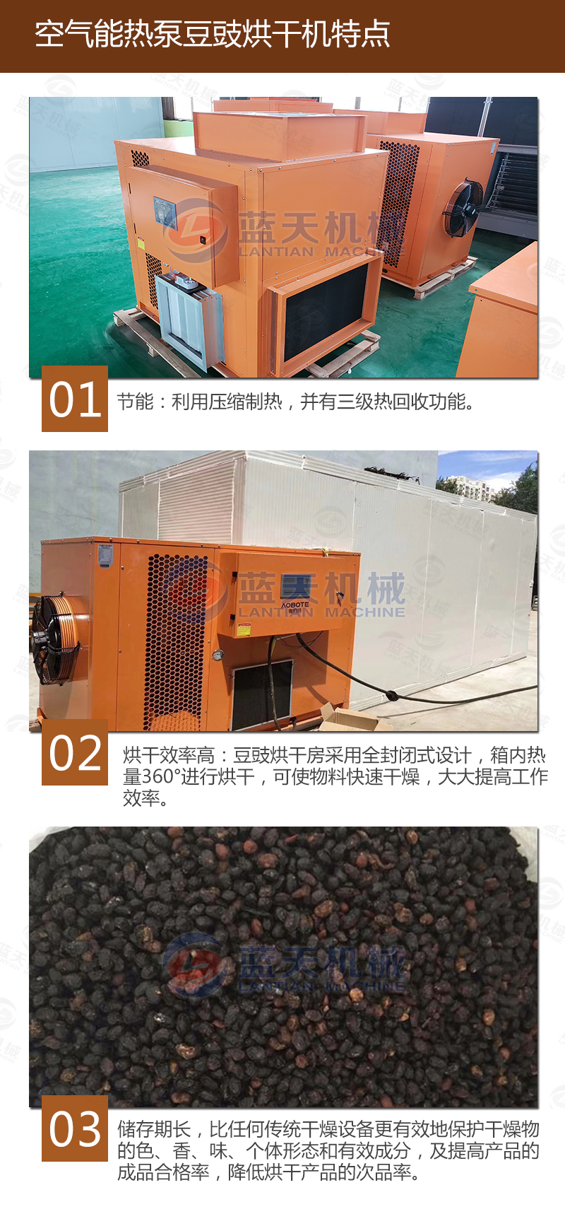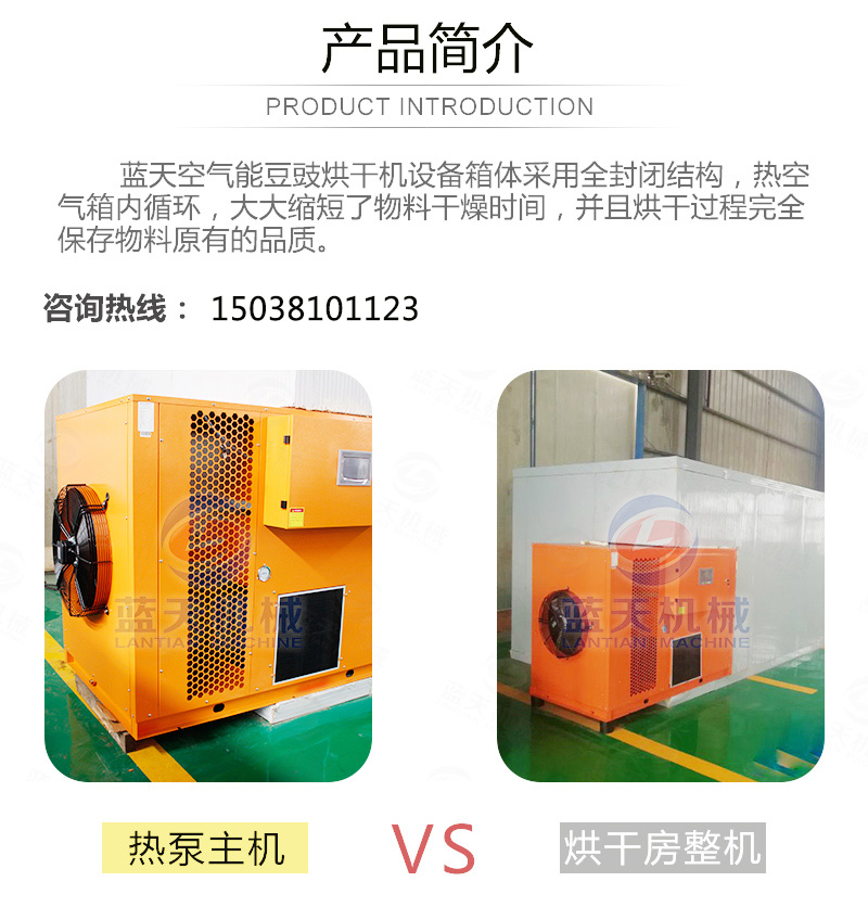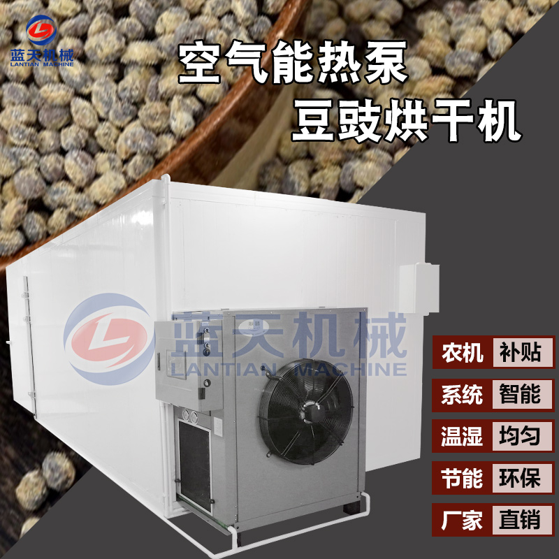 豆豉富含蛋白質(zhì)、各種氨基酸、乳酸、磷、鎂、鈣及多種維生素,色香味美,我國(guó)南北部都有加工食用。但若不注意加工藝,會(huì)致使品質(zhì)下降,甚至霉變,造成經(jīng)濟(jì)損失。傳統(tǒng)上使用太陽(yáng)光曬制,但是生產(chǎn)效率低下,并且在曬制過程中極容易有污染,本文介紹使用一種基于空氣能熱泵技術(shù)的豆豉烘干設(shè)備,大大加快了豆豉的生產(chǎn)流程。