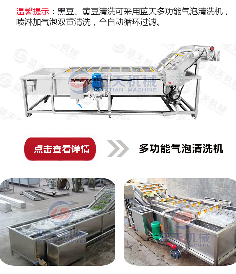 1、原料選擇及清洗:選擇成熟、顆粒飽滿均勻、皮薄肉多、無蟲蝕、無霉?fàn)€變質(zhì)、并且有新鮮度的黃豆或黑大豆為宜。用清水多次洗去大豆中混有的砂粒雜質(zhì)等。有條件的可以使用自動(dòng)化的果蔬清洗機(jī)來大批量清洗黑豆。