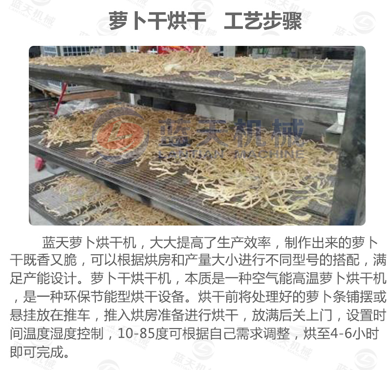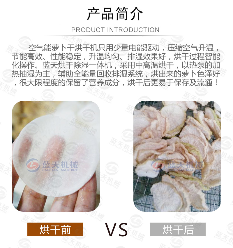蘿卜干是一種風味、具有悠久歷史的食品。傳統(tǒng)蘿卜干加工采用是風脫水的方法,利用日照和風力,加速蘿卜的蒸騰作用,使蘿卜大量脫水,并利用鹽的高滲透壓來保存。我們介紹一種基于空氣能技術(shù)熱風烘干的蘿卜干烘干機代替日曬來加工蘿卜干,加快蘿卜干加工過程。