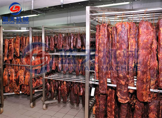 這一階段主要的制約因素是溫度的控制,為了加強(qiáng)干燥速度,溫度要升高到60到65度之間,烘干時間控制在10到12個小時,相對濕度控制在35%左右。牛肉烘干最終濕度控制在15%以下。