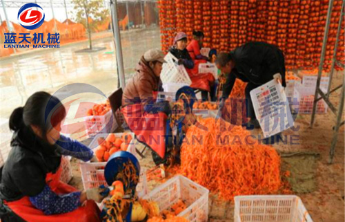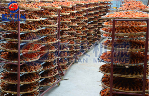 4:第一次烘烤 柿果進(jìn)入柿餅烘干機(jī)后,迅速升溫至40——50°c,使柿果內(nèi)乙醇脫氫酶活性處于最高狀態(tài)。內(nèi)呼吸也加強(qiáng),借以快速完成軟化,脫澀和部分脫水(25%左右),持續(xù)時(shí)間約12h,視柿果大小,成熟度靈活掌握。干燥柿餅時(shí),防霉十分關(guān)鍵,稍有不慎,即會(huì)在幾個(gè)小時(shí)內(nèi)造成整個(gè)烤房中的柿果霉?fàn)€損失。因此,需要使烤房?jī)?nèi)的相對(duì)濕度始中保持在70%以下,可有效防止柿果霉變。