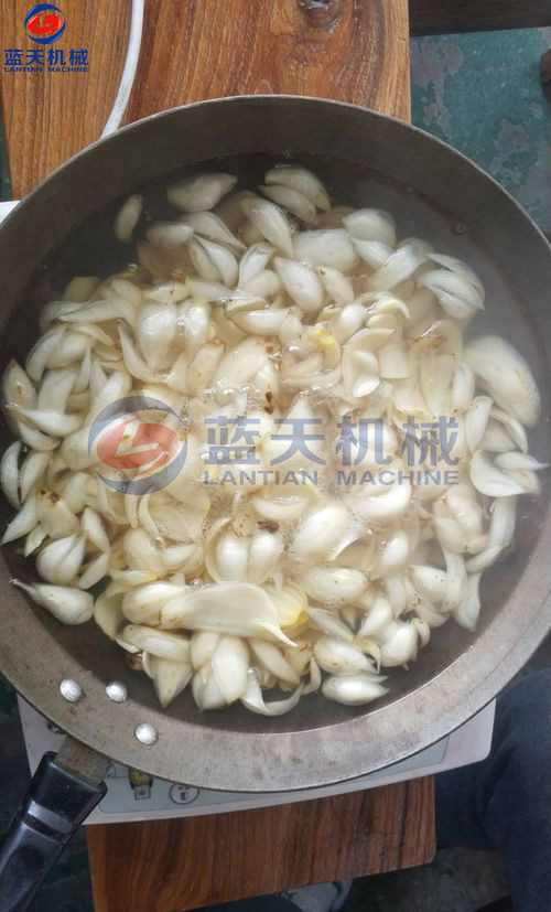 第三步:將煮好的百合鱗片撈出,放入冷水中冷卻,再撈出平鋪于物料盤(pán)內(nèi),瀝干水滴。