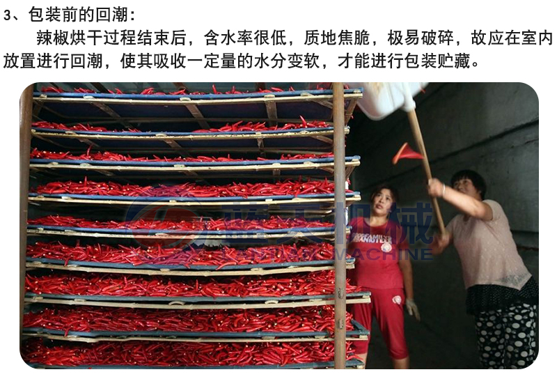 五:辣椒經辣椒烘干機烘干后,選檢要在干辣椒自然回潮一段時間后進行,否則干辣椒容易破碎;